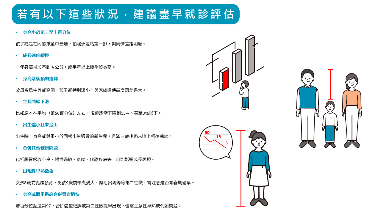 越早發現,越能掌握孩子的成長潛力,孩子的成長只有一次黃金期。透過生長曲線追蹤、專業醫師評估與家庭日常觀察,家長可以提早發現異常並介入治療,幫助孩子健康發育、充滿自信地長大。